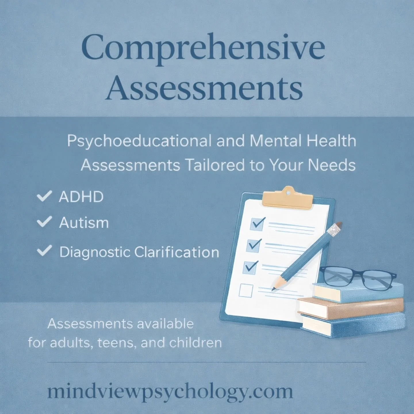 At Mindview Psychology, we offer expert mental health evaluations and psychological assessments for children, teens, and adults across a wide range of needs. Whether you’re a parent seeking answers, a professional referred by a physician or attorney, or someone looking for support on your own, we deliver compassionate, evidence-based assessments with clear and practical results.
